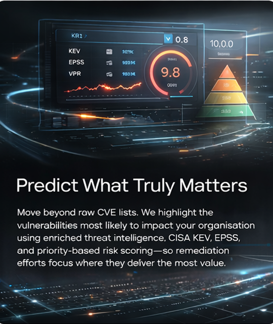 We correlate vulnerability data with threat intelligence and contextual risk factors to produce clear, actionable priorities so teams know exactly what to fix first and why.